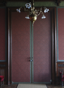 Der Festsaal auf Schloß Drachenburg, Königswinter ist auf zwei Seiten durch 4,30 hohe Schiebetüren zugänglich. Die farbige Dekoration der Türen war im Lauf der Zeit mehrfach überlackiert und gespachtelt worden. Bei den vom Saal wegweisenden Flächen war eine Freilegung möglich.