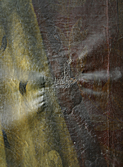Risse und Löcher wurden mit verschiedensten Gewebeflicken in mehreren Restaurierungsphasen hinterklebt. Zwei Flicken waren sehr naß mit heißem Glutinleim aufgeklebt. Durch die hohe Feuchtigkeit schrumpfte das Gewebe unter dem Flicken und verursachte Runzeln und Blasenbildung in der Bildschicht.