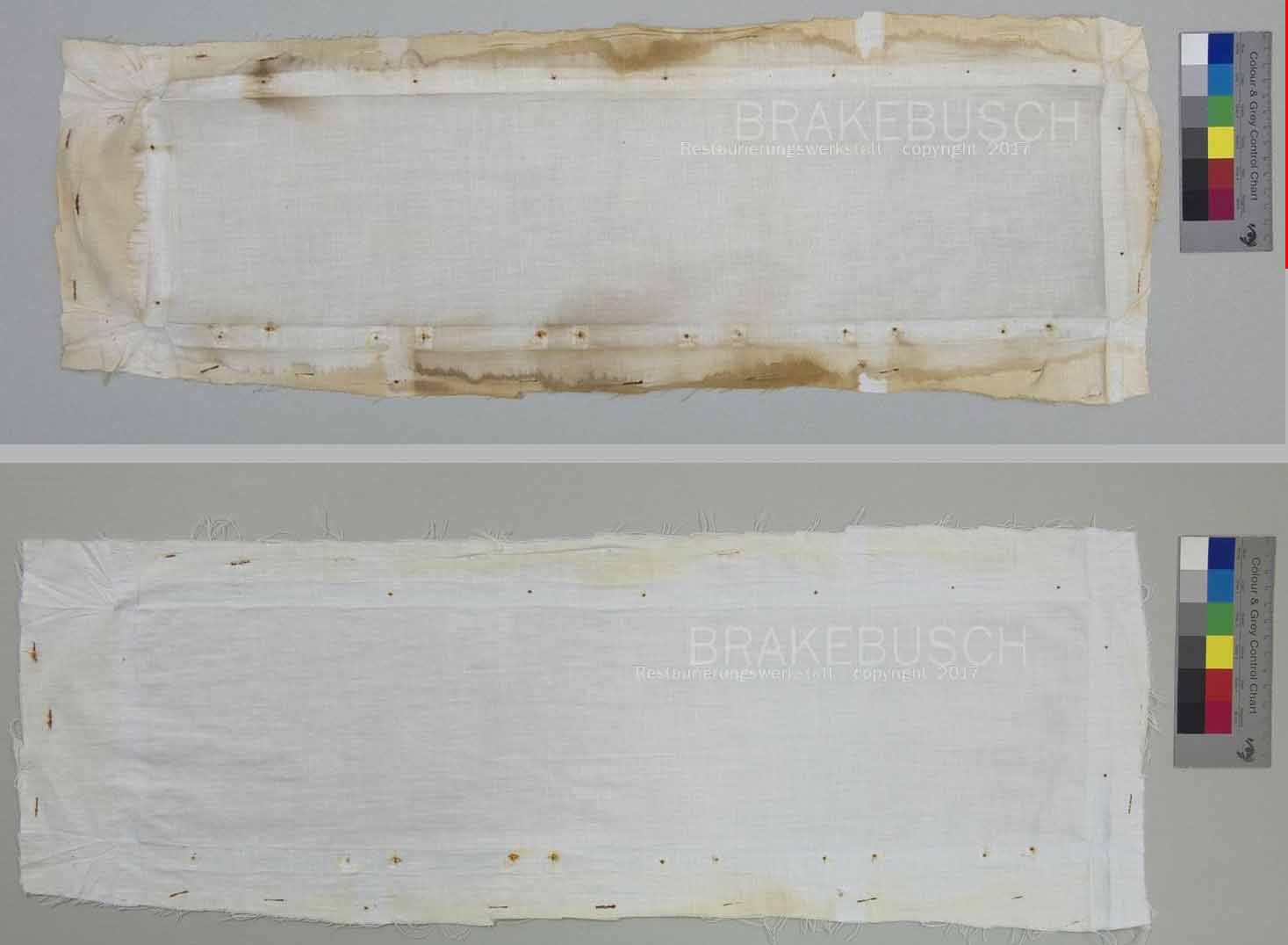 Gewebestreifen der Bespannung vor (oben) und nach der Restaurierung